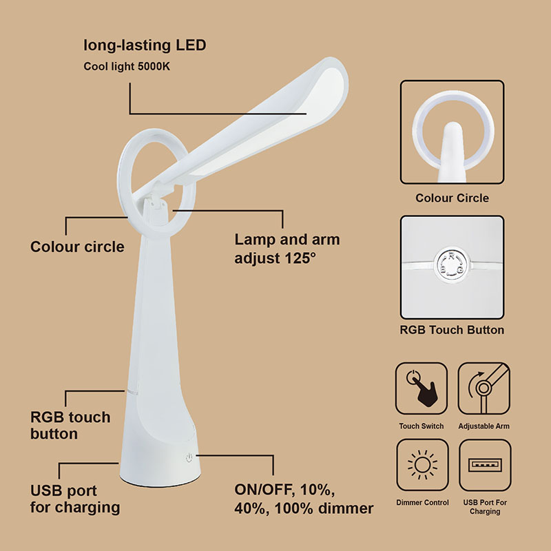 Decor rgb led asztali lámpa fénye 3 halványítható vissza a termék testén. A led lámpafej max. 125°-ban nyitható.