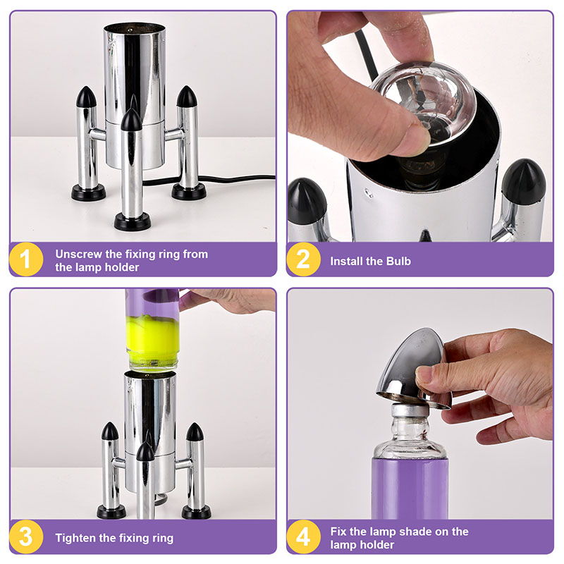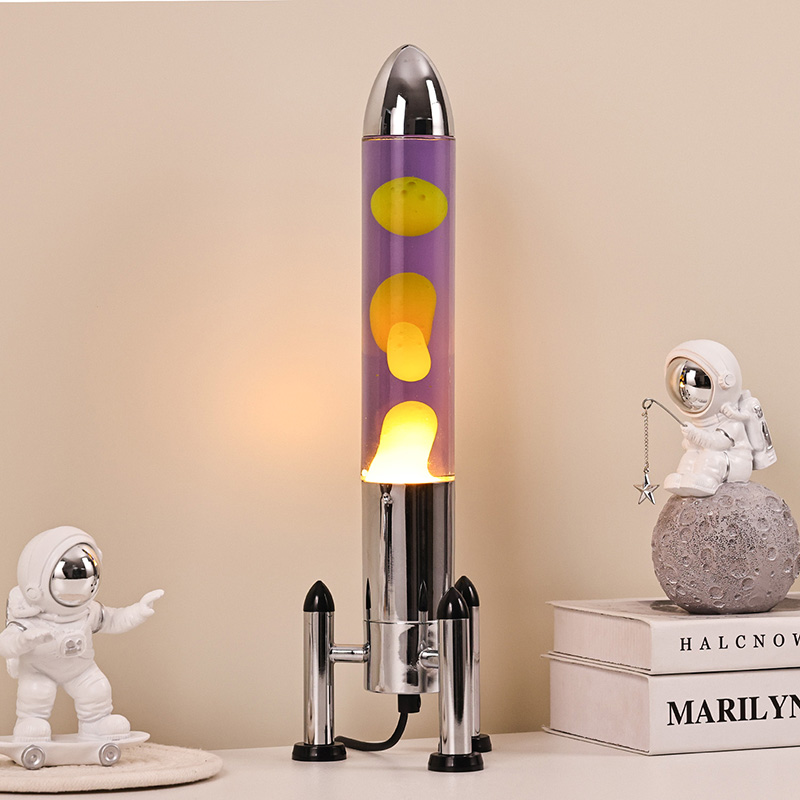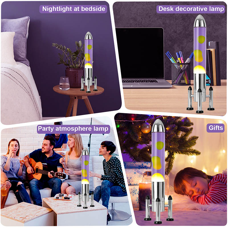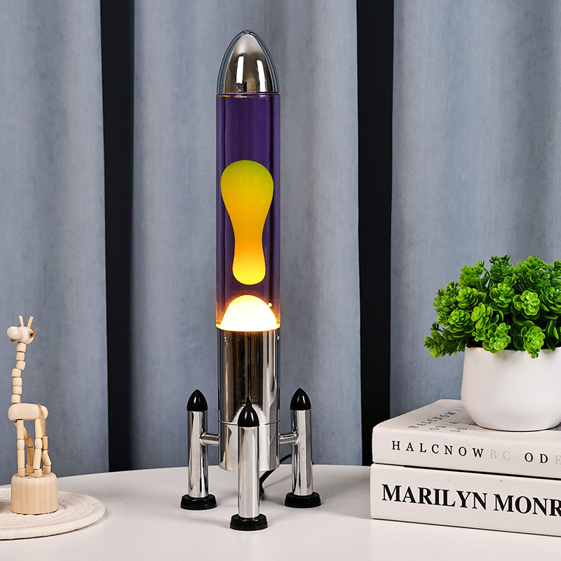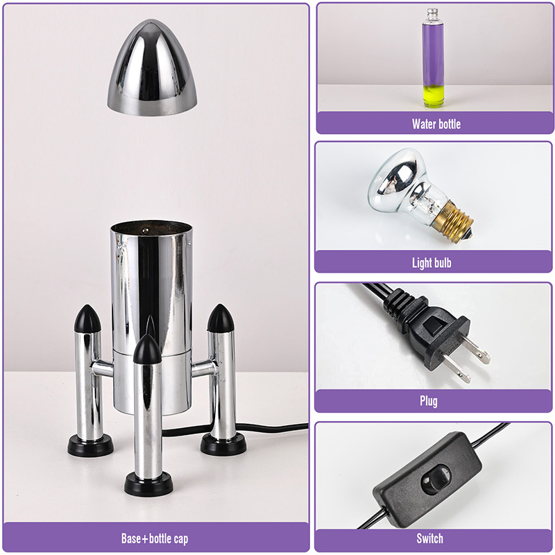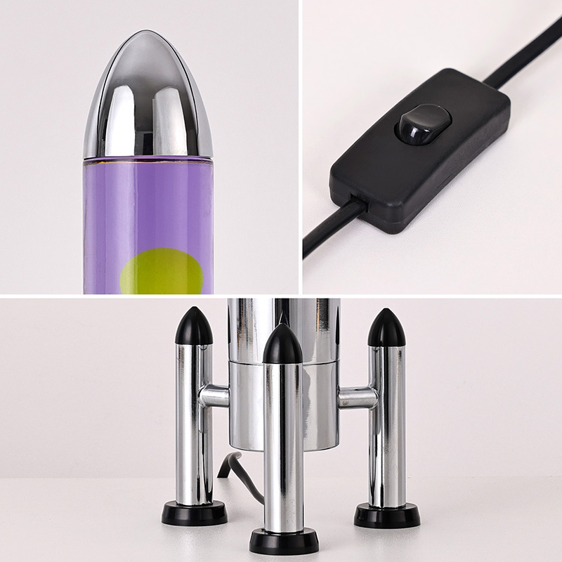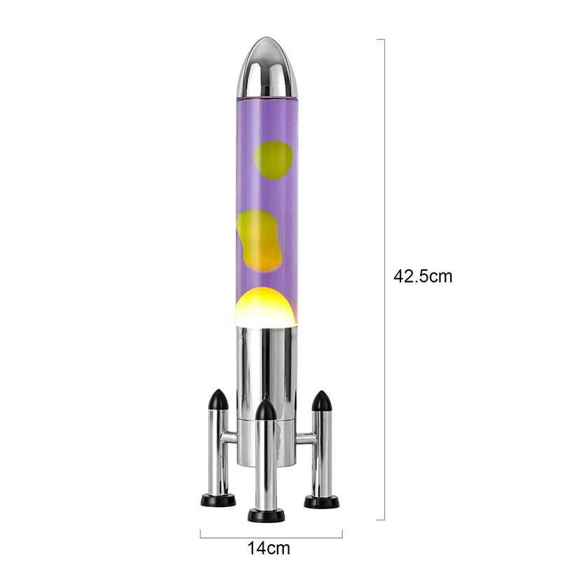 24VA rakétaernyővel ellátott, nagyméretű LED-es lávalámpa klasszikus rakéta formájú kivitelben, ezüst fémhéjjal és átlátszó üvegpalackházzal párosul, egyszerű, mégis stílusos. A belső lila folyadékban sárga úszik