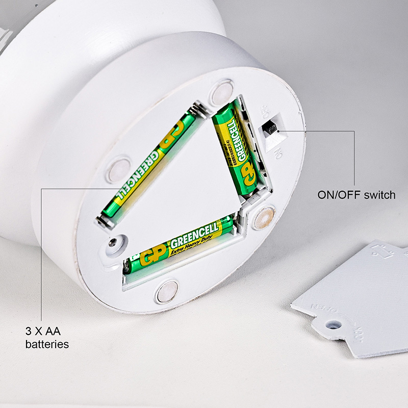 Nincs szükség csatlakoztatásra; mindössze 3 AAA elemmel működtethető, egyszerű telepítés és rugalmas használat jellemzi. Akár éjjeliszekrényre, íróasztalra, babaágyra, akár kempingbe vitte