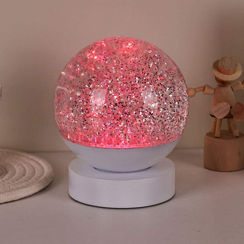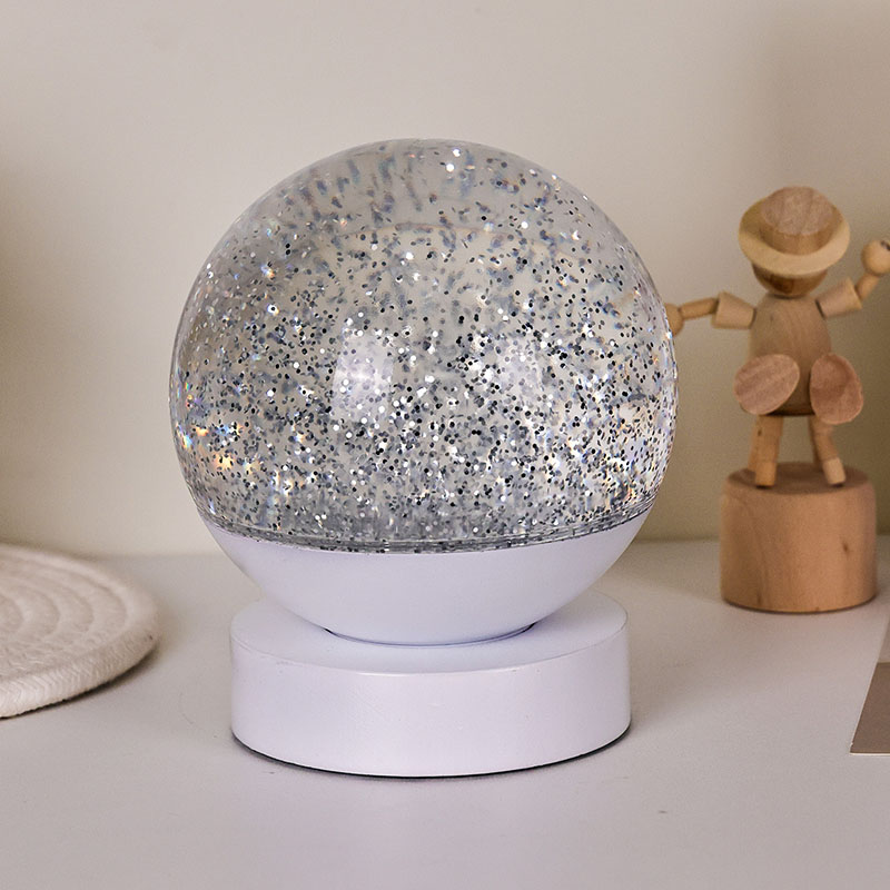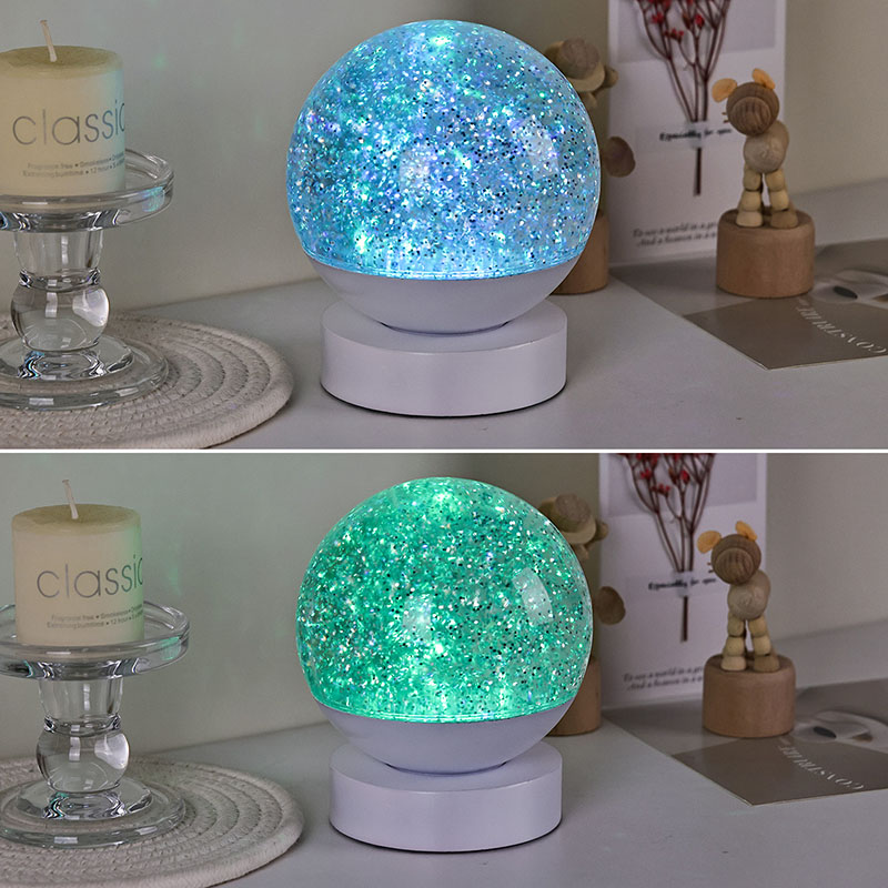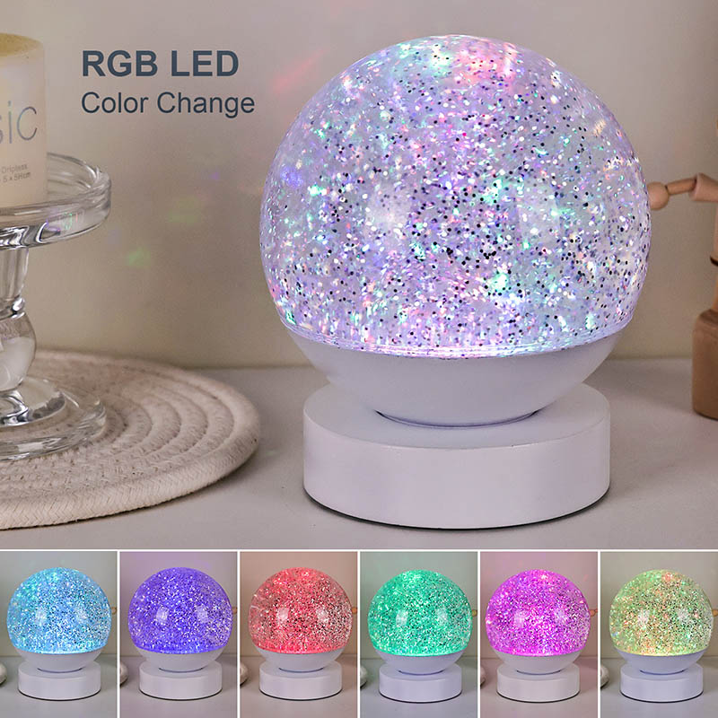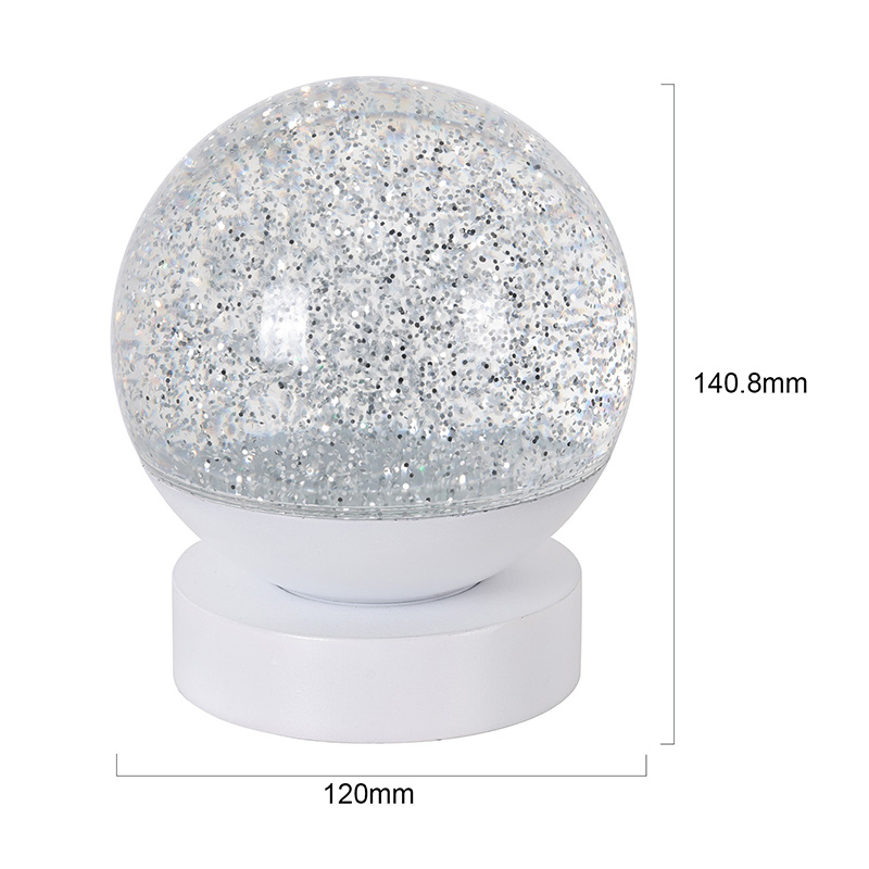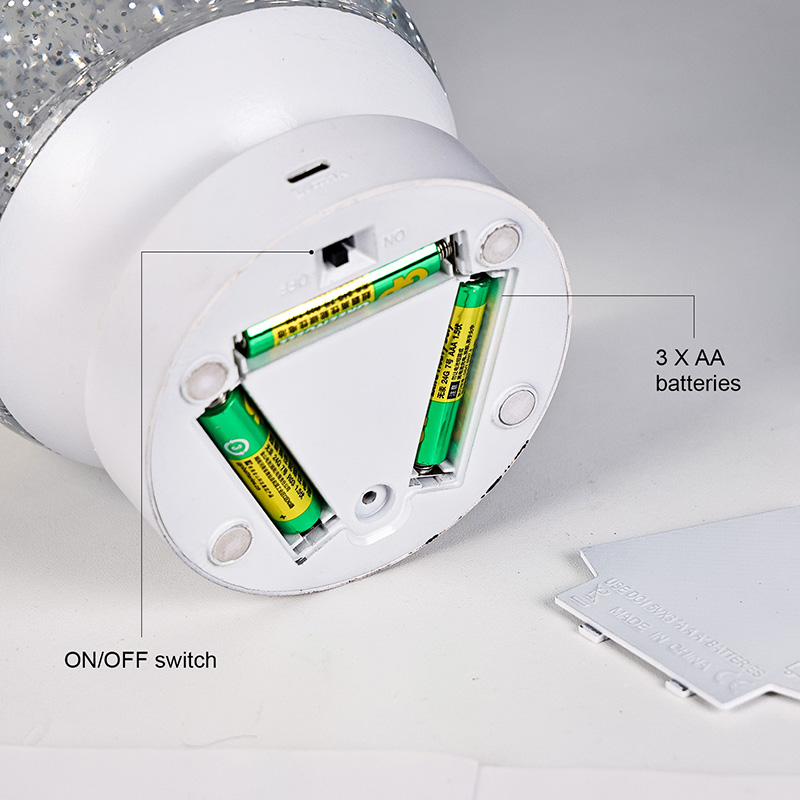 A Led RGB Glitter Decor lámpa kiváló minőségű akril anyagból készült, áttetsző gömbje kiváló fényáteresztő képességgel rendelkezik. Az alap környezetbarát ABS műanyagból készült, amely biztosítja a stabilitást, a tartósságot és a biztonságot mérgező anyagok nélkül. Három beépített AAA elemmel működik (külön megvásárolható elemek), így nincs szükség konnektorra, és kényelmes használatot tesz lehetővé. Tökéletes elhelyezésre az ágy mellett, íróasztalon vagy a gyerekjátéksarokban. Egy egyszerű érintéskapcsolóval a lámpa egyszerűen be- és kikapcsolható, így akár gyerekek számára is felhasználóbarát az önálló működés.
